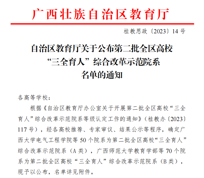 喜讯:必赢国际bwin入选自治区第二批全区高校“三全育人”综合改革示范院系 来源: 作者:必赢国际bwin 编辑:必赢国际bwin 发布时间:2023年10月09日 16:56 浏览次数:【字体:小 大】【打印正文】 近日,自治区教育厅公布了第二批全区高校“三全育人”综合改革示范院系遴选结果,必赢国际bwin“书院制‘14565’ 协同育人模式”成功入选全区高校“三全育人”综合改革示范院系(A类单位)! 文件截图