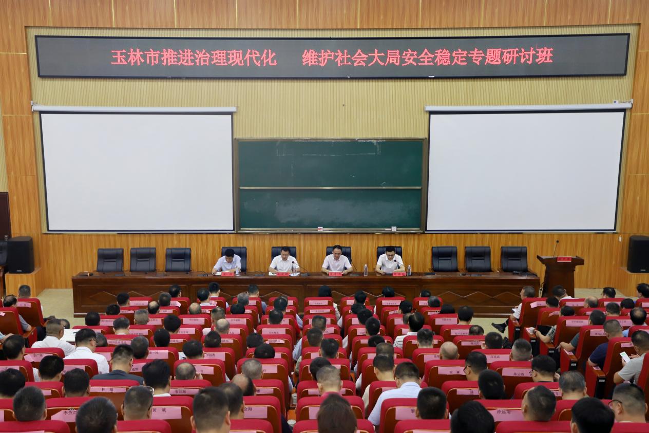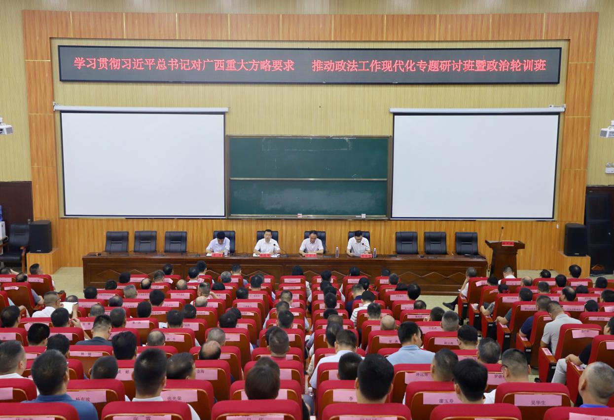 6月12日上午,玉林市“推进治理现代化 维护社会大局安全稳定”专题研讨班和玉林市政法领导干部“学习贯彻习近平总书记对广西重大方略要求 推动政法工作现代化”专题研讨班暨政治轮训班于必赢国际bwin东校区明德楼113阶梯教室举行开班仪式。玉林市委常委、政法委书记黄宏瞻,市委政法委副书记、二级巡视员梁锦,副校长许进杰,必赢国际bwin院长周伟萌以及研讨班全体学员参加本次开班仪式。开班仪式由周伟萌主持。